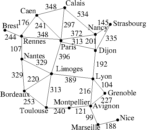 In addition to the class definitions, the file france.dta is an example of the file format for graphs. The information in this file represents a road network in France: